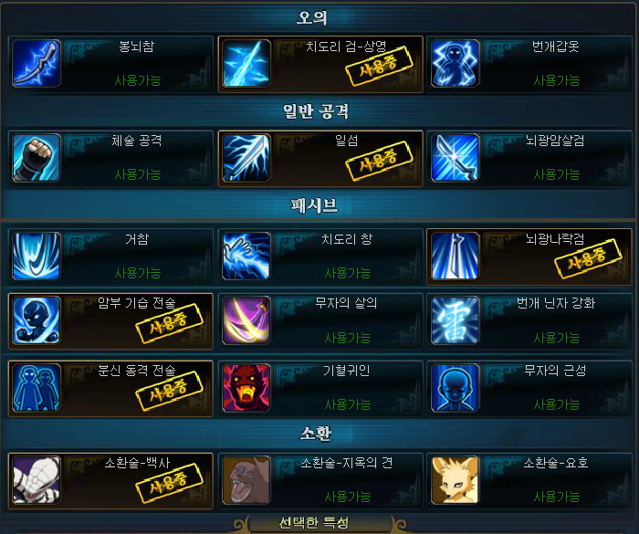 주인공 체술공격- 봉혈장타(히나타) - 발도참(미후네) - 유보 쌍사권(히나타) - 거대 뱀(주인공) - 치도리창(주인공) 화둔 - 용화의 술