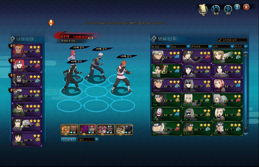 위 조합에서 카카시를 쓰는 이유는 제가 소환수가 아직 모이지 않아 추격콤보용으로 사용하는 것이며 추후에는 히나타로 바꿀 계획입니다.