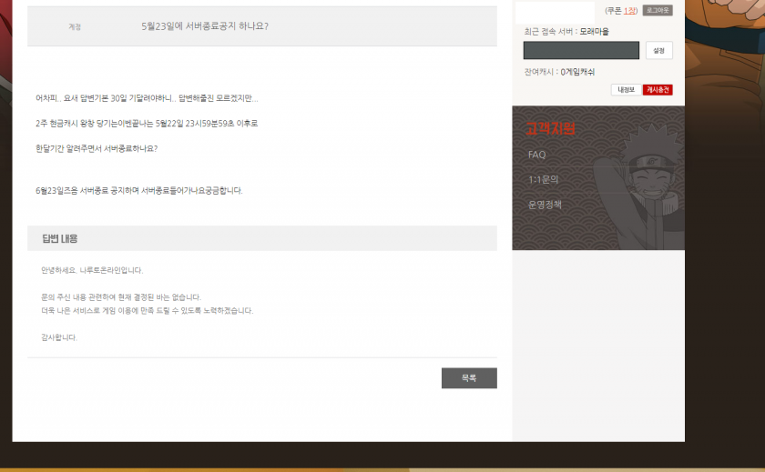 저도 이벤트 2주간 똑같은거하고 원보 이벤트만하는게 섭종하려고 하는거 아닌가요? 라고 물어보니 위의 대답과 똑같은 답변이 왔었습니다. 저는 그래서 더 나은 서비스한다고하길래 아 섭종은 아니겠구나 생각했었는데 오늘 수요일날 이벤트 업데이트 2주간 또 원보 이벤트만있는거보고 섭종가겠구나 생각하고있습니다. 정말 열심히 게임했는데 섭종하면 너무 아쉬울것같아요. ㅜ.ㅜ 6월 29일날이 이 게임 4주년이죠? 서비스 연장안했으면 이제 섭종 얼마 안남았네요. 원보 이벤트만하는게 원보사용하고 환불 적게해주려는 의도같아서 저는 기운이 빠지네요. 오늘 접으려고했지만 길드님들이 말려서 지금 고민중입니다. ㅜ.ㅜ 내 아까운 오와리들......ㅜ.ㅜ