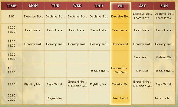 토요일 아레나선계전장 16:30~17:05, 캣퀴즈 19:30~22:30, 닌자대전 1st 20:30, 2nd 21:15, 3rd 22:00