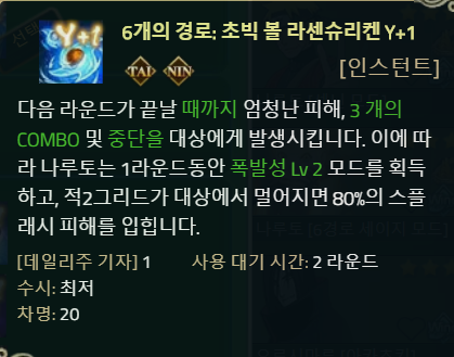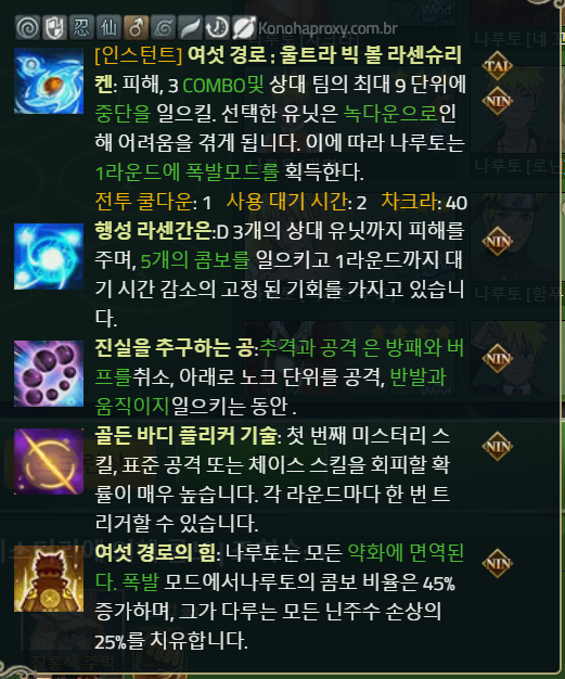 25~35퍼센트로 치유 또 모든라운드 나루토의 육도모드를 실행 퇴대9명의적과 5콤보 회피불가한 손상을 일으키는
