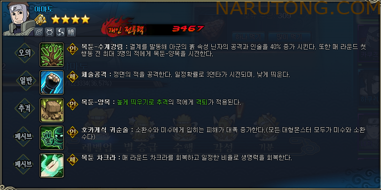 닌자이미지는 쉽게 가져올 수 있어요. 저는... 스킬설명 부분, 뒤에 은근히 비치는게 거슬리는데 그냥 이대로 갈까요;;; 넘 고민되네요... 원래 목적은, 각 오의/일반/추격/패시브를 따로 입력해서 db를 만들고 그걸 가지고 시뮬레이터 만들때 사용할 생각이었거든요. 이미지로 올리게 되면 닌자 개수만큼 캡춰해서 올려야 하는데... 트래픽도 상당하겠고 뭔가 프로페셔널하지 못한 느낌인데, 어찌할지 고민되네요.