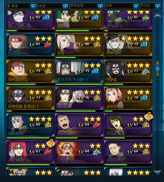 위에 두 덱은 버텨서 로우시랑 셀쿠라를 키우는 덱이고 아래 덱은 딜짱짱 덱이네요. 어떤 부분이 답답하신가요? 아마도 위의 두 덱은 딜이 안나와서 답답하신 것 같고 아래 덱은 덱구성이 좋아서 잘 모르겠네요. 아래 덱에서 좀 더 안정성을 추구하시려면 다음와 같이 해보세요. 쵸쥬로 / 오비토 / 아오 / 수둔