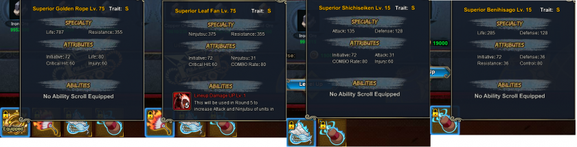 주로 로프 3개와 호리병 1개를 사용하며 호리병은 쉴드버프 닌자(이루카, 킬러비 등)나 주인공 닌자(화둔, 토둔)을 줍니다.