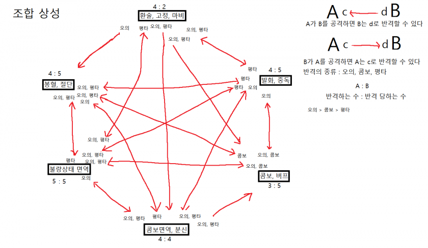 이것을 기본으로 각각의 조합과의 관계를 보면 공격 했을 때 반격당하지 않는 가장 좋은 조합은 환술, 고정, 마비이고 반격당하기 가장 쉬운 조합이 콤보, 버프로 나타났고