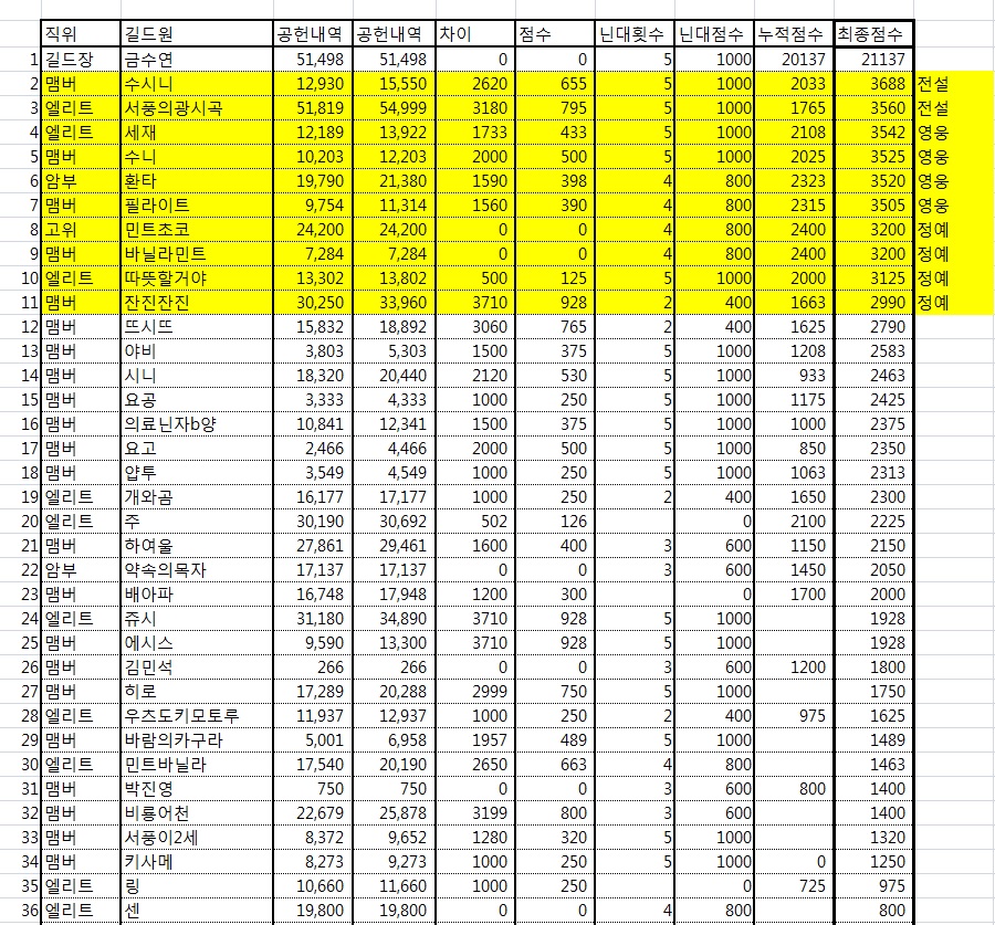 최근자 전체서버 / 각 서버 별 투력순위