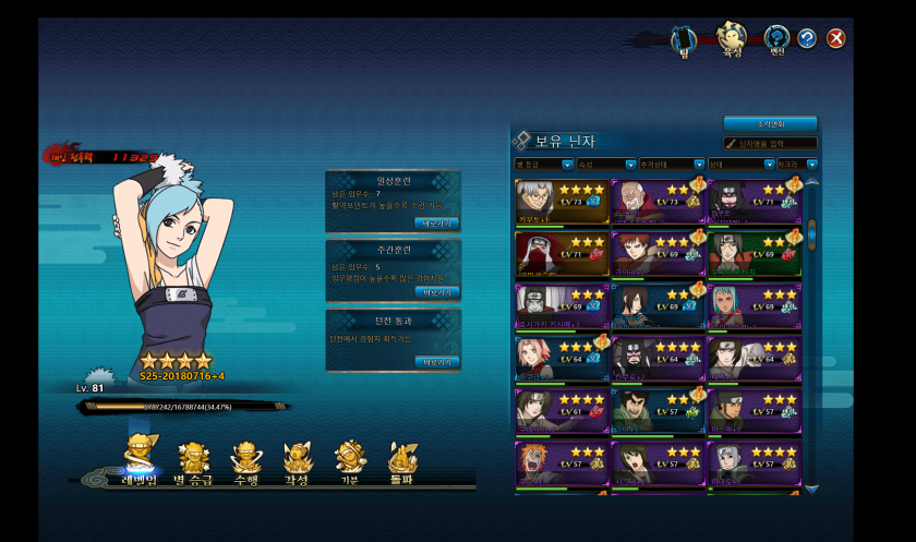 닌텐(닌자대전 텐텐)덱 가시는게 좋을거 같네요. 1 마부이 2 닌텐 3 메이 6 수둔 321(수룡쏘는거)31 솬수는 뇌호왕, 아니면 백호