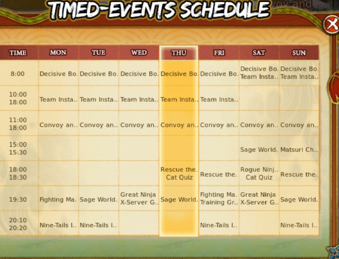 토요일  아레나선계전장 16:30~17:05, 탈주닌자 19:00~19:30, 캣퀴즈 19:30~22:30(20분마다 열림, 9턴 있음), 닌자대전 1st 20:30, 2nd 21:15, 3rd 22:00