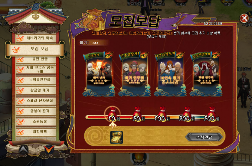 결과적으로 애기하자면 확정보상은 없고 만개를 지르던 10만개를 지르던 원하는 닌자는 안나올수잇답니다.
