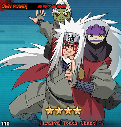 패시브1:매라운드 시작전 아군 선인닌자 디버프 제거및 차크라 20 회복 맥스차크라 100 복원(이건 뭔지 모름), 이 기술이 발동할때마다 아군 선공 2퍼(최대10퍼센트)증가