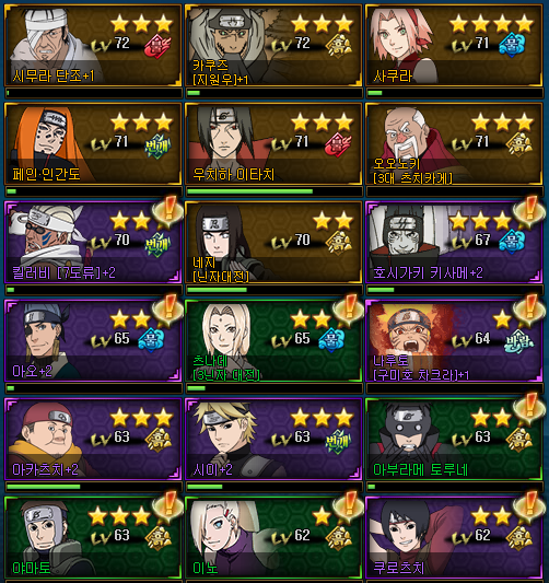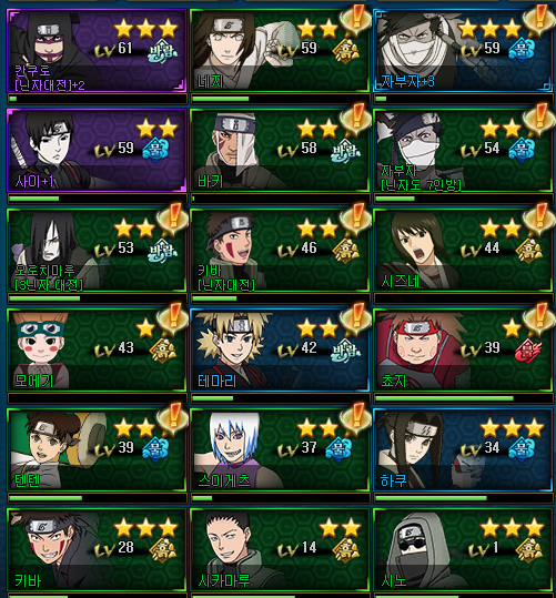 현재는 뇌둔(뇌갑, 일섬, 거합, 무살, 무근), 오모이, 사무이, 히나타(8콤)이구요