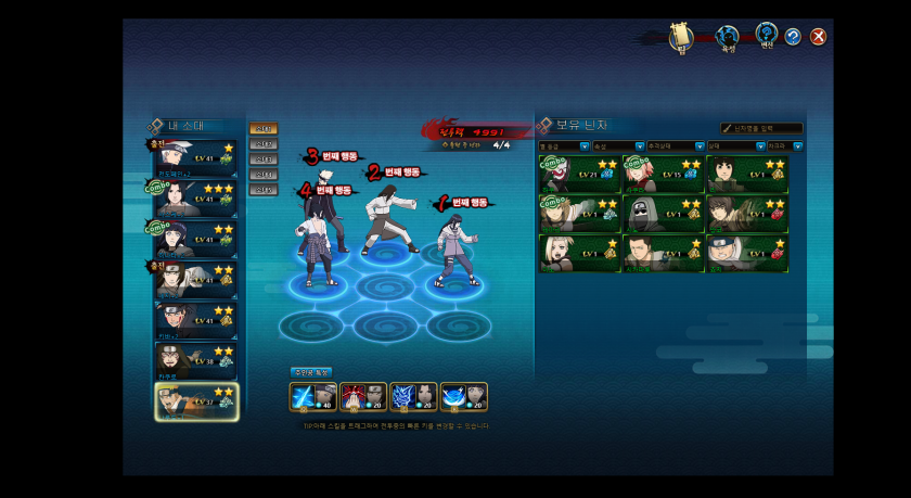 요렇게 놓으시면서 하는게 좋을듯. 2틀뒤에 카부토 나오면 사쿠라랑 바꿔 주시구요, 7일보상 카카시 나오는것도 챙기세요, 사스케 3성 하위버젼인데 물분신이 있어서 버리긴 아깝습니다.