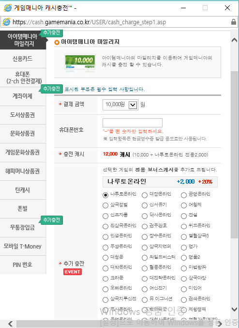 보이시죠? 계좌이체와 무통장입금, 마일리지로 충전할시 20프로를 추가로 충전시켜준다는 겁니다.